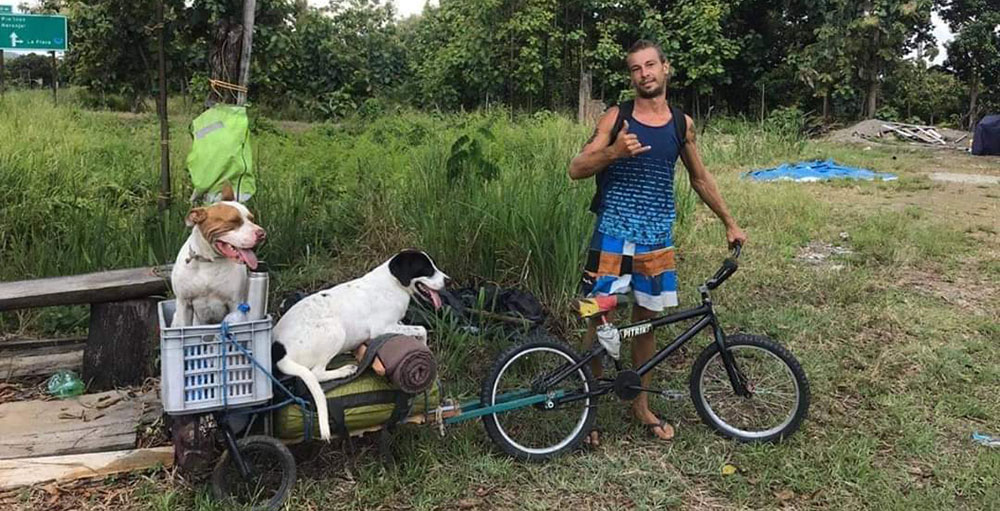 El misionero contó que vivió diversas experiencias, incluso le robaron la billetera con sus documentos y el dinero que tenía para solventar sus gastos. Poco después, compró una bicicleta: “Vendí mi tabla de surf y compré la bici. Le tuve que hacer muchas modificaciones y agregarle un carrito para llevar a los perros, porque ellos no pueden caminar mucho”.
