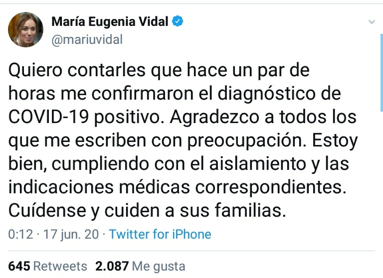 La exgobernadora de la provincia de Buenos Aires y una de las dirigentes más importantes del PRO, Maria Eugenia Vidal, se contagió de COVID-19.