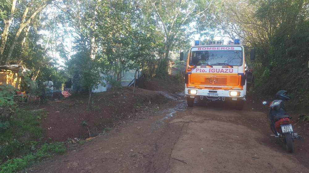 Hoy aproximadamente a las 8:40, los Bomberos Voluntarios de Iguazu reciben una denuncia de incendio de vivienda en el Barrio Hermoso, por la calle Marcos Rodas, en cercanías al arroyo Mbocaí.