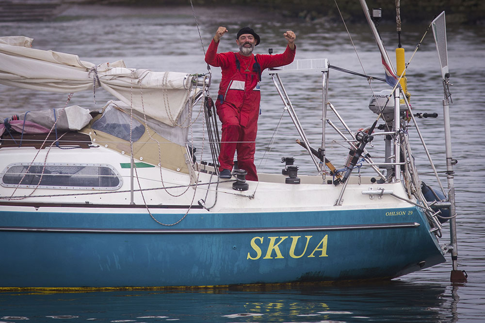 Envuelto en su equipo de agua rojo, el hombre alzó los brazos sobre la cubierta del “Skua” para festejar, mientras su hermano, un grupo de amigos y personal del club lo saludaba desde un espigón.