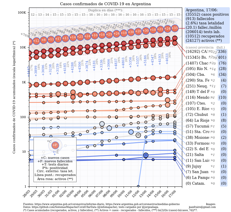 El número total de acumulados por jurisdicción indica que la provincia de Buenos Aires suma 15.345 casos, la Ciudad de Buenos Aires 16.299, Chaco 1.407, Chubut 72, Córdoba 504, Corrientes 107, Entre Ríos 105, Formosa 33, Jujuy 9 y La Pampa 6. La Rioja alcanza 64 casos, Mendoza 116, Misiones 38, Neuquén 251, Río Negro 595, Salta 21, San Juan 7, San Luis 11, Santa Cruz 51, Santa Fe 290, Santiago del Estero 22, Tierra del Fuego 149, y Tucumán 57.