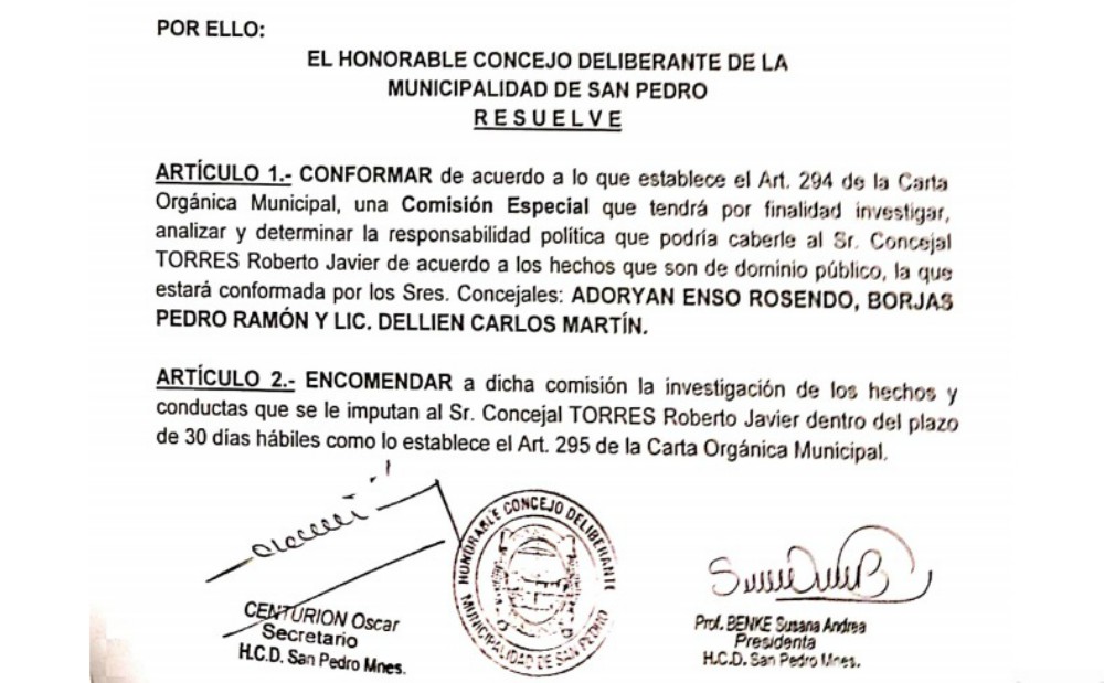 Así, el cuerpo deliberativo de San Pedro determinó “conformar de acuerdo a lo que establece el Art. 294 de la Carta Orgánica Municipal, una Comisión Especial que tendrá por finalidad investigar, analizar y determinar la responsabilidad política que podría caberle al concejal Javier Roberto Torres, de acuerdo a los hechos que son de dominio público”.