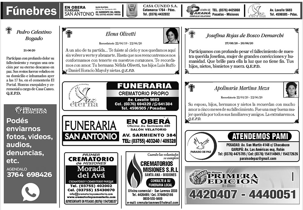 Fúnebres del lunes 22 de junio de 2020