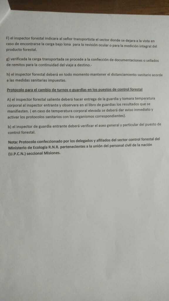 Los inspectores forestales enrolados en el gremio UPCN elaboraron un protocolo y elevaron al ministro de Ecología, Mario Vialey, buscando colaborar con la gestión y el cuidado de la salud de trabajadores y transportistas. Pretenden que lo aprueben y pongan en funcionamiento.