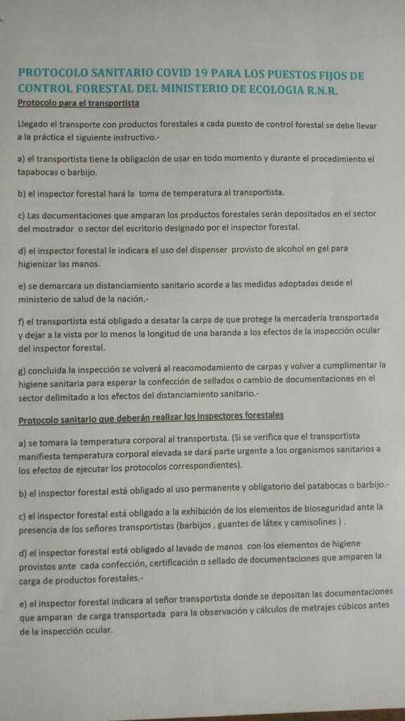 En los puestos fijos el transportista tiene la obligación de usar en todo momento barbijo. El inspector forestal deberá tomar la temperatura corporal del conductor y le indicará donde dejar los documentos (en el mostrador) para inspeccionar.