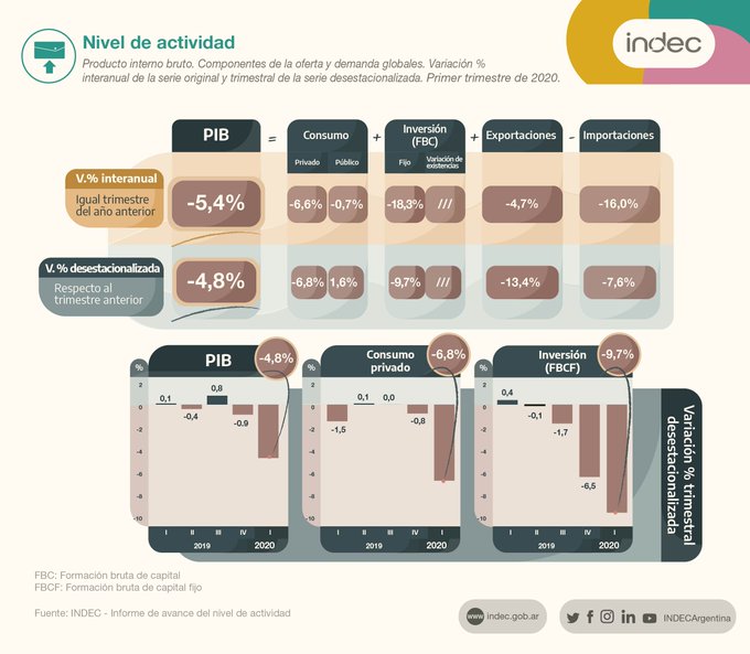 Los datos del primer trimestre reflejan que, si bien aún la pandemia de coronavirus no impactaba a pleno en el nivel de actividad -la cuarentena se aplicó el 20 de marzo último-, la economía argentina ya arrastraba fuertes problemas.