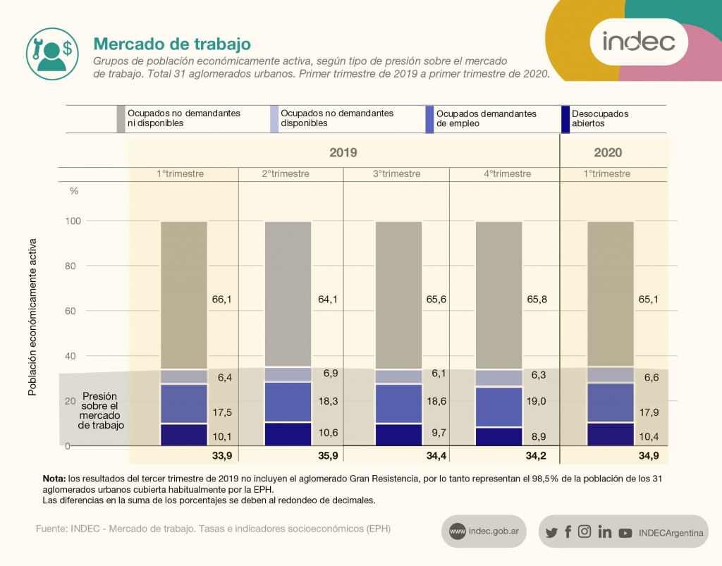 Según el INDEC las personas afectadas por la desocupación en los 31 distritos relevados llega a 1.394.000, mientras que los subocupados son 1.569.000.