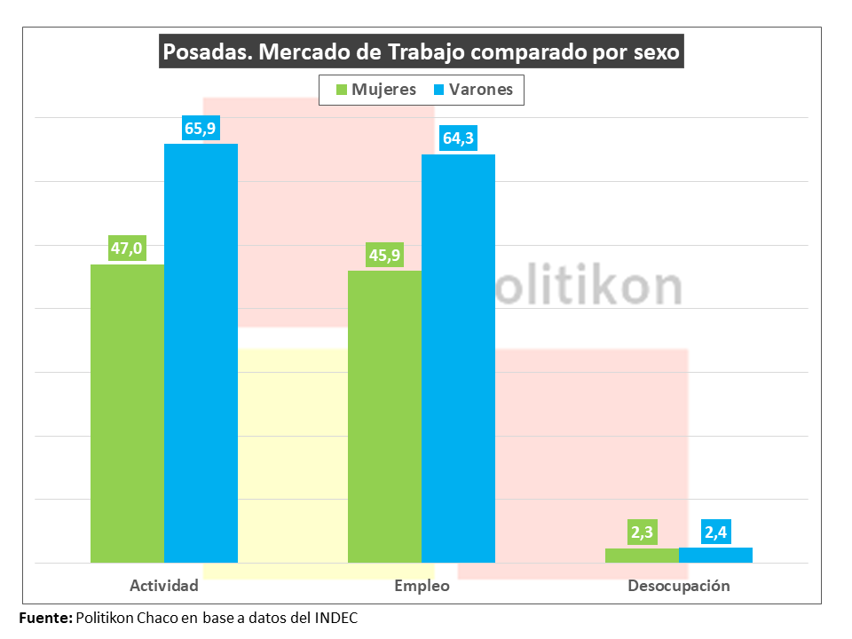Si se analizan los datos del mercado de trabajo en Posadas según sexo, las mujeres tienen menores tasas de actividad y empleo (47,0% vs 65,9%; y 45,9% vs 64,3% respectivamente); pero en el caso de la desocupación, es levemente mayor en los varones (2,3% vs 2,4%).