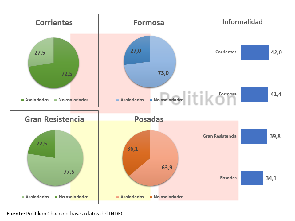 Comparado entre las regiones del país, al primer trimestre del 2020 el NEA tiene las tasas más bajas de todo el país: la desocupación fue del 5,4 (el Gran Buenos Aires tiene la más alta con 11,5), pero al mismo tiempo, los niveles de actividad y de empleo son también los menores en toda la Argentina (42,3 y 40,0 respectivamente).
