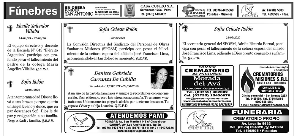Fúnebres del miércoles 24 de junio de 2020