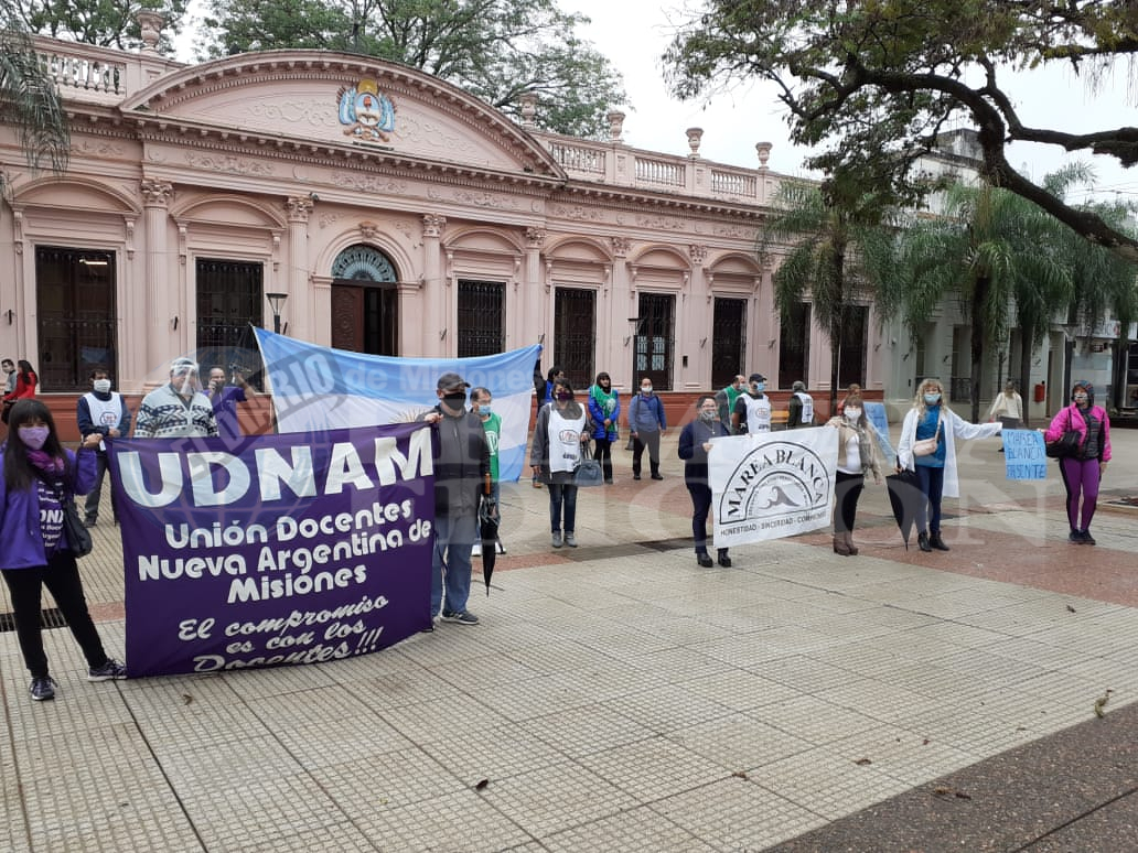 Referentes de gremios docentes, se manifestaron ayer frente a Casa de Gobierno para reclamar el básico de $12.800 y exigir la participación de los educadores y padres en la elaboración del protocolo de regreso a clases, entre otras problemáticas educativas.