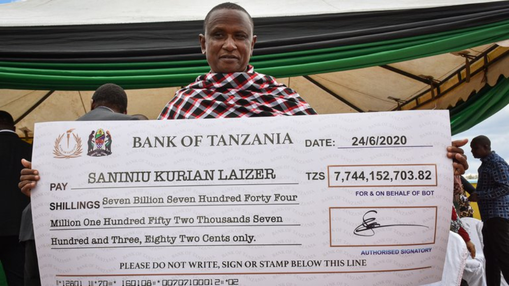 El gobierno de Tanzania pagó a Laizer un cheque por el equivalente a unos USD 3.3 millones a cambio de las dos piedras preciosas de color azul violeta oscuro.