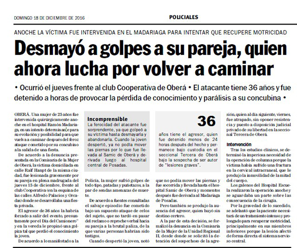Tal como publicó oportunamente este Diario, el jueves 16 de diciembre de 2016 la pareja había concurrido a una fiesta en el Club Cooperativa de Oberá. Según indicaron fuentes de la investigación, ocurrió una discusión entre ambos y el hombre la obligó a salir por la fuerza del lugar.
