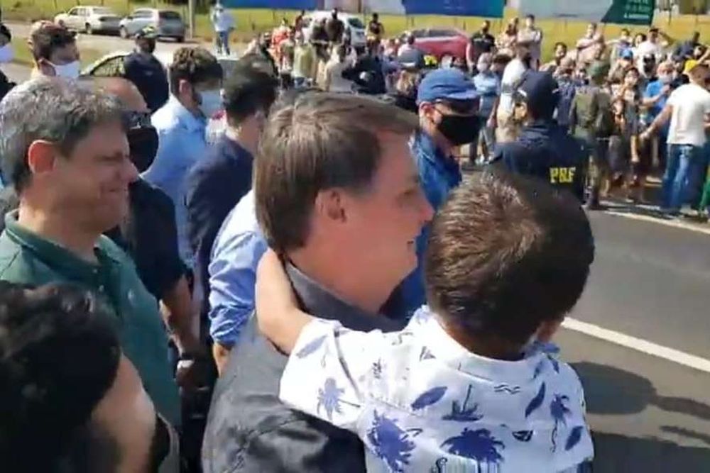 En Araguari, Bolsonaro estaba parado al costado de una carretera saludando a los conductores y simpatizantes al otro lado de la ruta. Se tomó fotos con niños, incluso abrazó algunos, y una señorita.