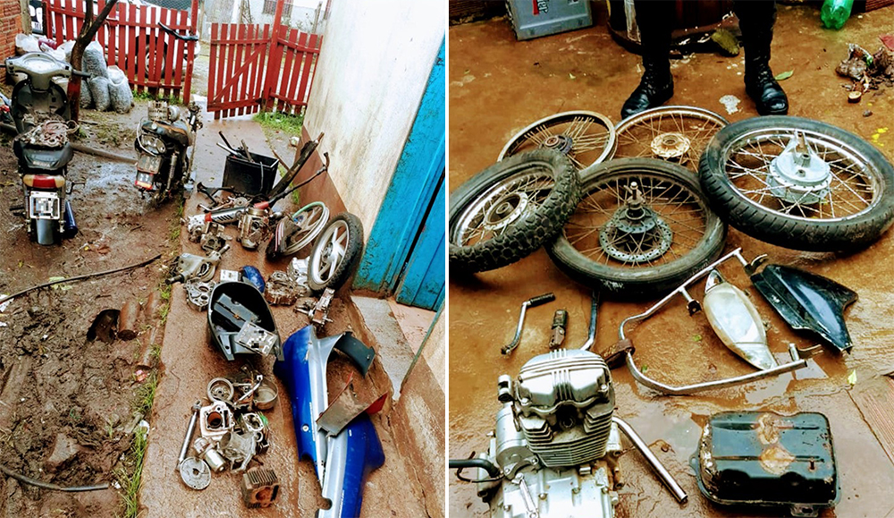 En una de las viviendas, hallaron motopartes de dudosa procedencia las cuales fueron incautadas. Mientras que en el segundo inmueble, secuestraron gran cantidad de motopartes como ser motores, patentes, llantas, plásticos cobertores y repuestos.