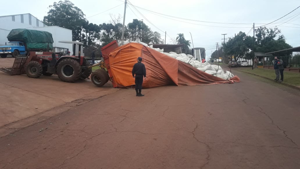 Un vehículo tipo maquinaria agrícola, con acoplado cargado de bolsas de yerba canchada, conducido por  Guillermo A. de 41 años, volcó por causas que se desconocen, arrojando así sobre la cinta asfáltica aproximadamente 250 bolsas.