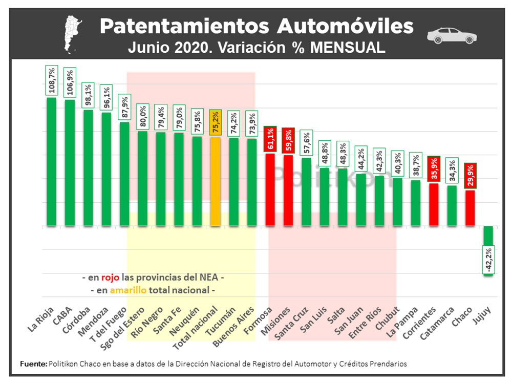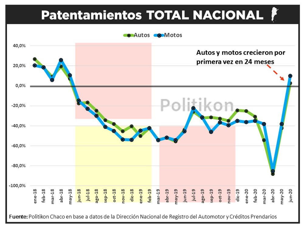 En todo el país, durante junio de 2020 se patentaron un total de 37.271 automóviles, que equivale a un incremento respecto al mismo mes de 2019 del 2,6%, siendo de esta forma el primer crecimiento interanual en dos años. Además, es importante destacar que, comparado con el mes anterior, junio tuvo un alza del 75,2% en el total nacional.