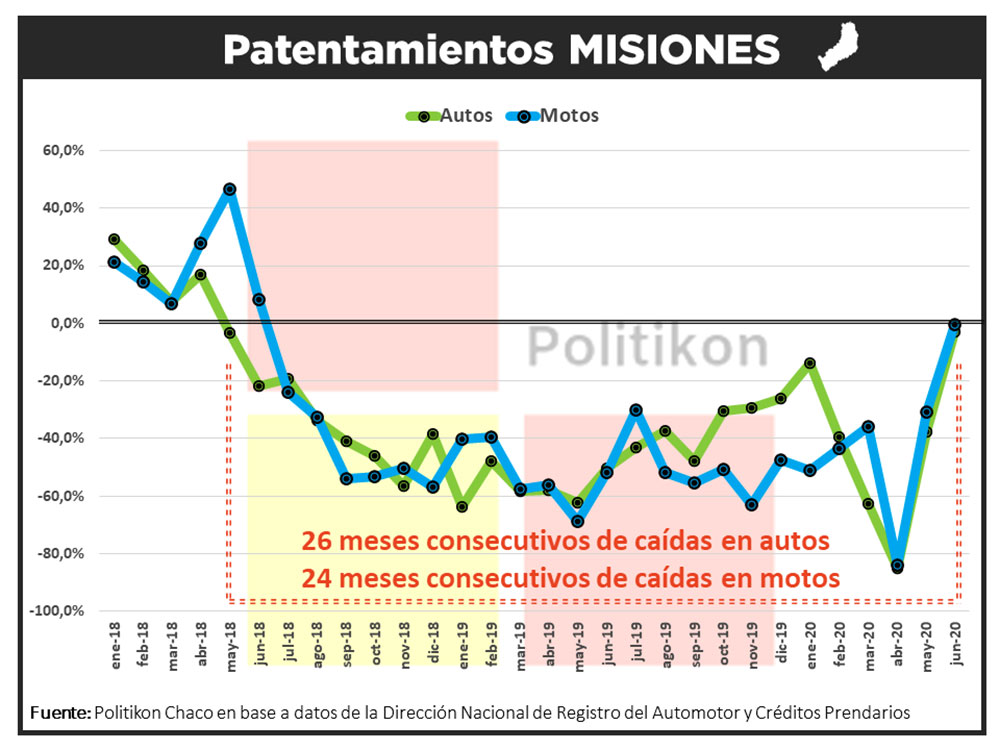 De este modo, Misiones acumula 26 meses consecutivos de caídas interanuales de patentamientos de autos y 24 en motos.