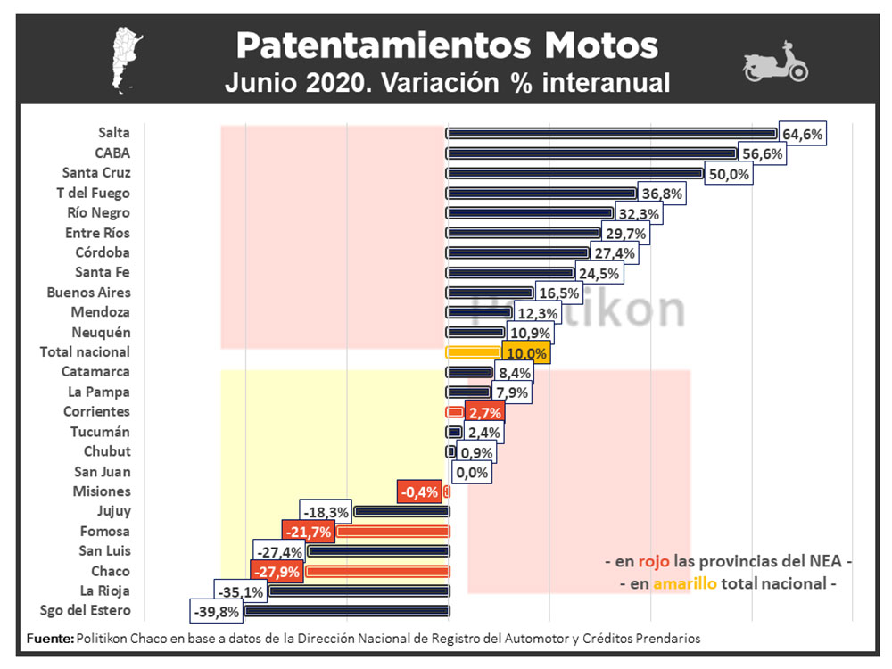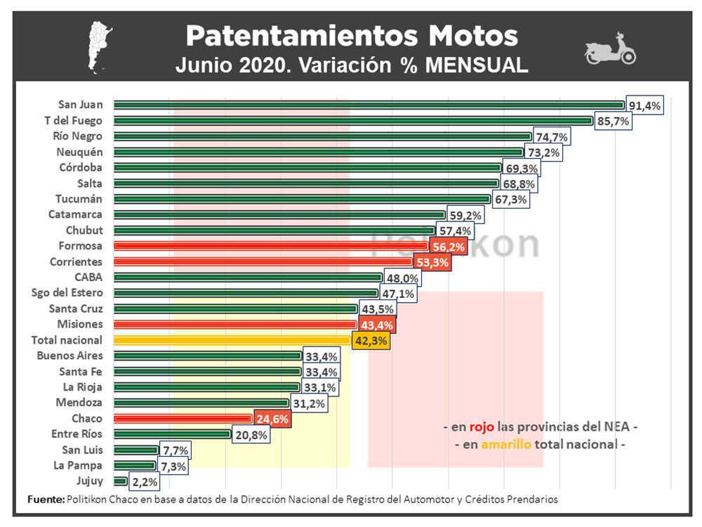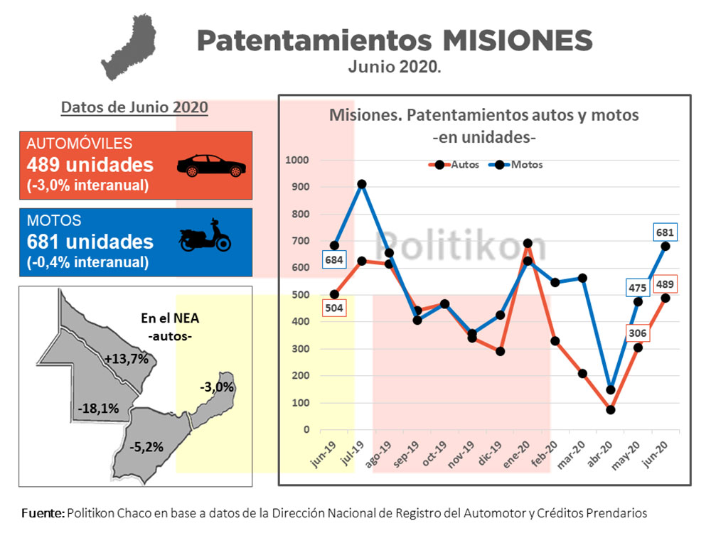 A su vez, en la provincia de Misiones se patentaron 681 motos, que equivale a una caída interanual de solo el 0,4%, siendo el más bajo del país, pero considerando que sólo siete provincias tuvieron descensos. A su vez, comparado con el mes anterior (mayo 2020), los patentamientos de motos crecieron en Misiones un 43,4%.