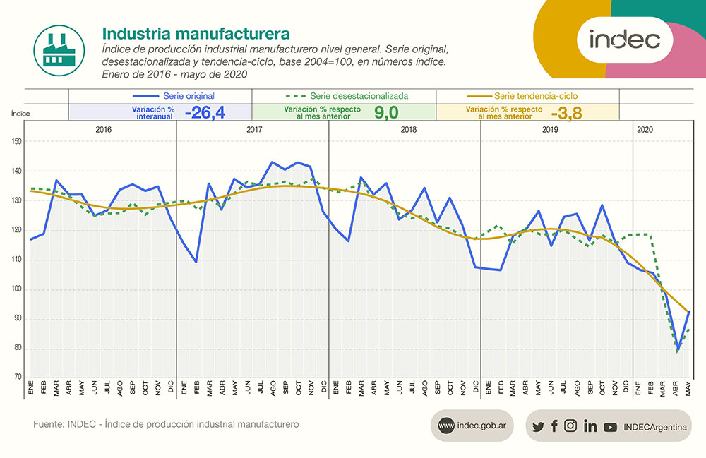 La actividad de la industria registró en mayo una caída de 26,4% en relación a igual mes del año pasado y se recuperó 9% en comparación a abril, informó este martes el Instituto Nacional de Estadística y Censos (Indec)