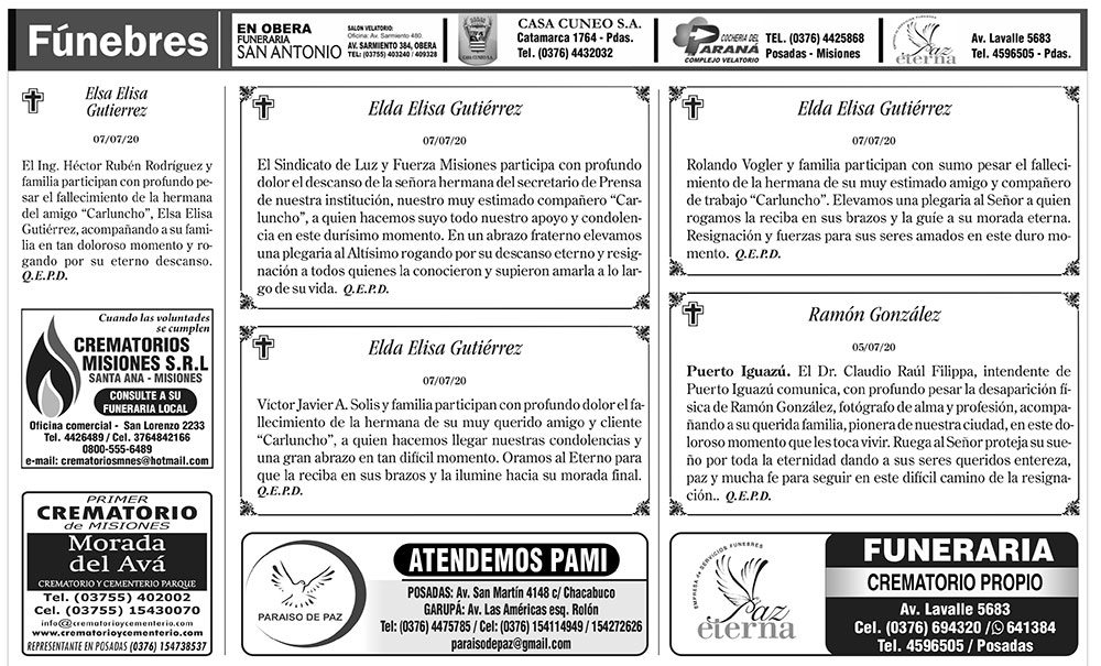 Fúnebres del miércoles 8 de julio de 2020