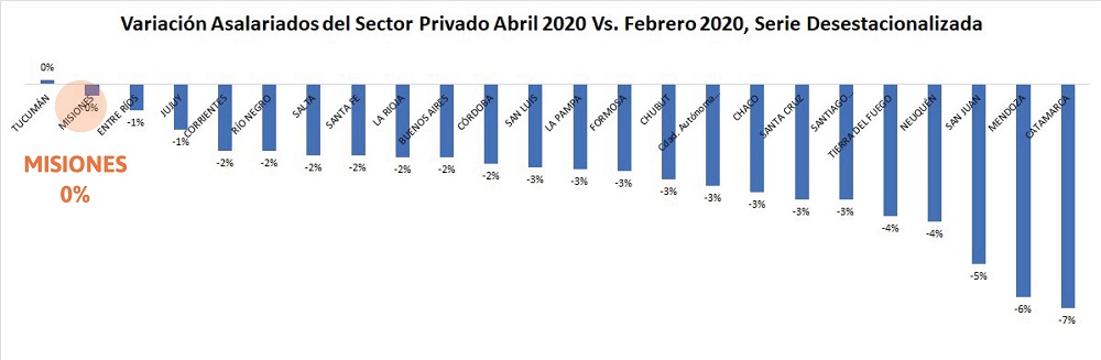 También se refirió Safrán al empleo y publicó un gráfico en el que señaló que Misiones está entre las provincias con menor descenso del empleo registrado en la cuarentena.