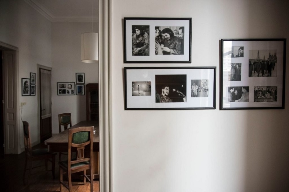 Se accede al salón después de subir por un ascensor de reja acorde a la época, y son justamente imágenes que retratan a Guevara las que dan la esperable bienvenida acomodándose por el living principal y recuperando distintos momentos de la vida del revolucionario más icónico de todos los tiempos iluminados por la luz que se cuela desde la calle por ventanales con banderola de medio punto.