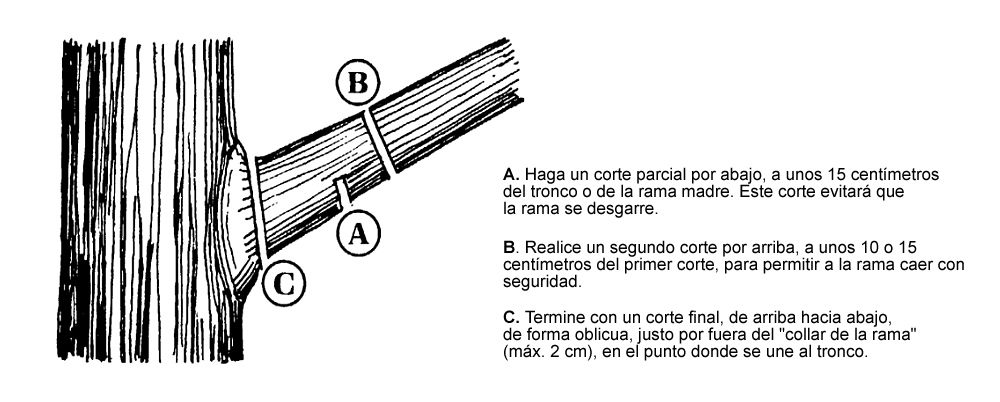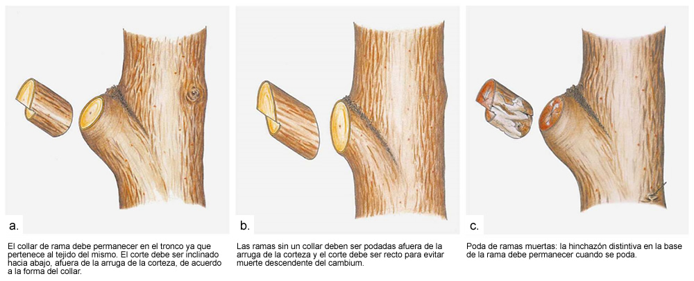 En primer lugar, se debe tener presente que todo corte de una rama significa una herida para el árbol. Mientras más grande sea la herida, más grande es el defecto y por tanto mayor es la exposición del árbol al ataque de insectos, hongos y enfermedades, motivo por el cual ninguna rama debe ser cortada sin una razón.