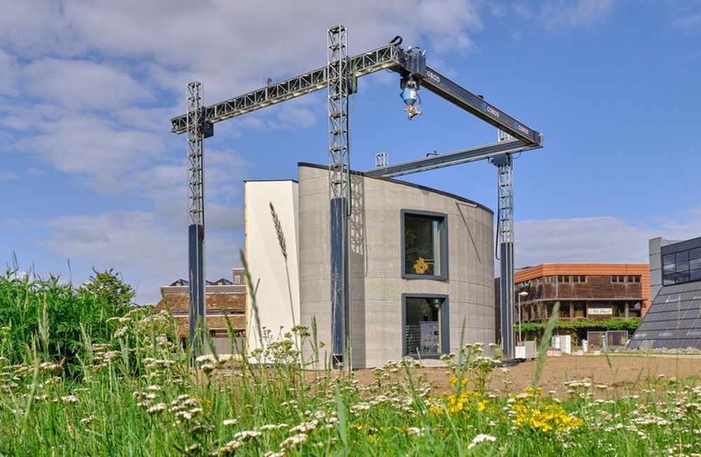 El trabajo se llevó a cabo con una impresora de la firma COBOD, que consta de cuatro columnas de 10 metros de altura en cuyo interior se desplaza el cabezal de la impresora, añadiendo capas de cemento a la construcción como si fuera crema pastelera.