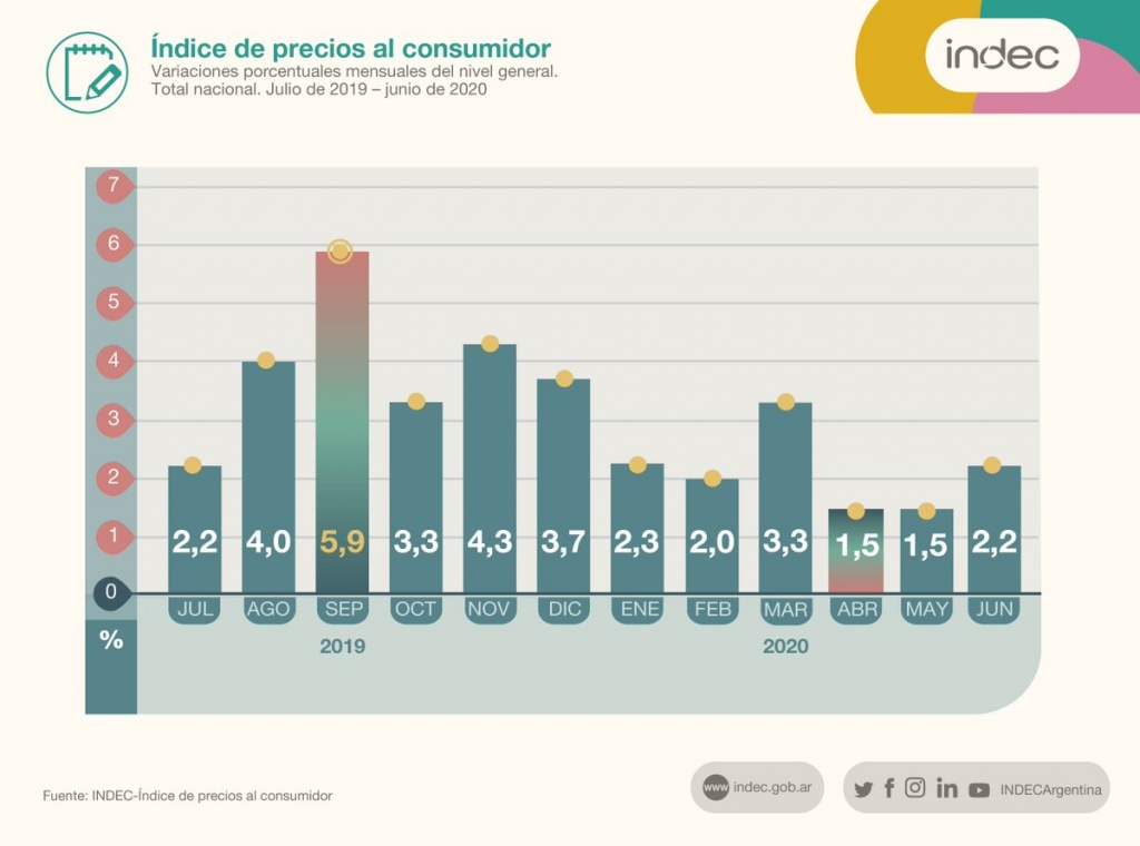 La inflación de junio fue de 2,2% y acumuló 42,8% en el último año