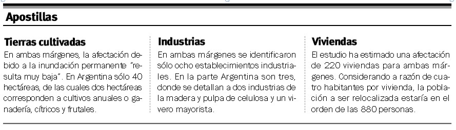 • La afectación de tierras cultivadas o cultivables en ambas márgenes, debido a la inundación permanente “resulta muy baja (652 hectáreas)”.