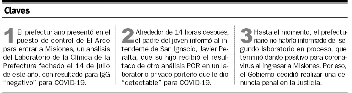 Hasta ayer, mientras se continuaban las averiguaciones, quedaban muchas dudas respecto a si el joven prefecturiano habría informado en el puesto de control policial de ingreso a Misiones, tanto al personal de Salud como de la Policía, que la segunda prueba en un laboratorio privado estaba en proceso.