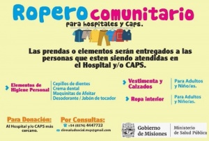 El Ministerio de Salud Pública (Tucumán 2174) está juntando prendas de vestir y elementos de higiene para donar a las personas que lo necesiten y que se encuentren internados en hospitales o CAPS.