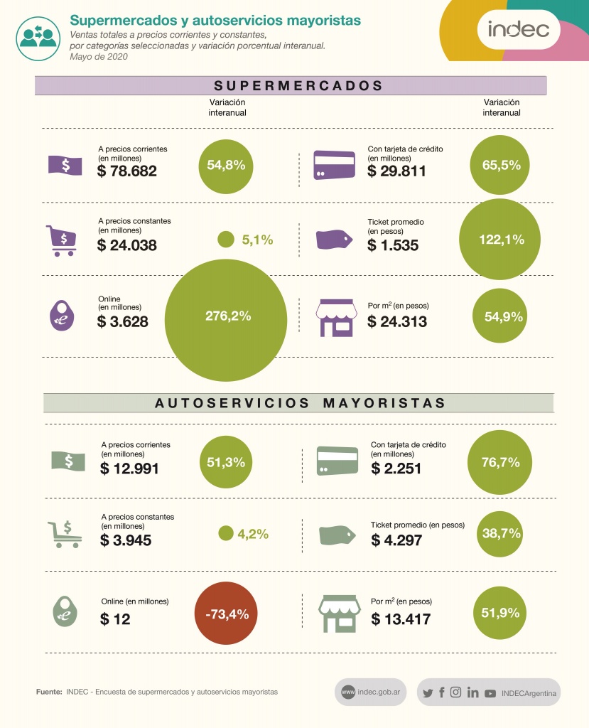 Las ventas en los supermercados a precios corrientes por canales online sumaron $ 3.628 millones de pesos, que representó un aumento del 276% respecto al mismo mes del año anterior, mientras que en los autoservicios las ventas por ese sistema llegaron a $12 millones y cayeron un 73,4% interanual.