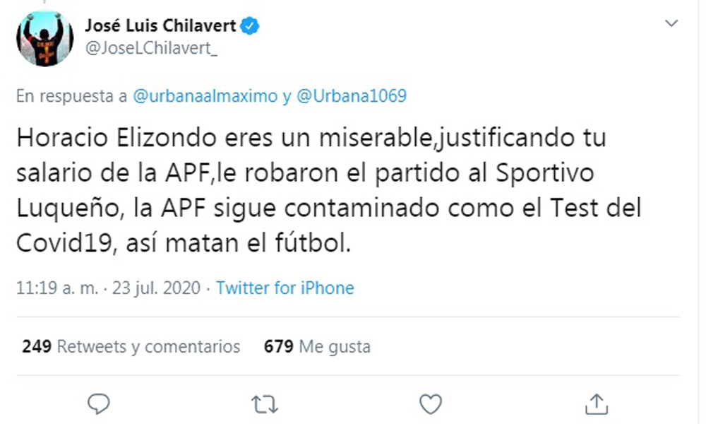 “Horacio Elizondo, eres un miserable justificando tu salario de la APF. Le robaron el partido al Sportivo Luqueño y la APF sigue contaminado como el test del Covid-19, así matan el fútbol”, señaló el exarquero en su cuenta de la red social Twitter.