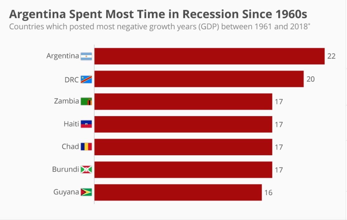 El Banco Mundial rankeó a los países en función de cuántos años estuvo en recesión desde que se hace esa medición (1960). En el top ten está Surinám, Haití, Congo y otros, pero al tope está Argentina.