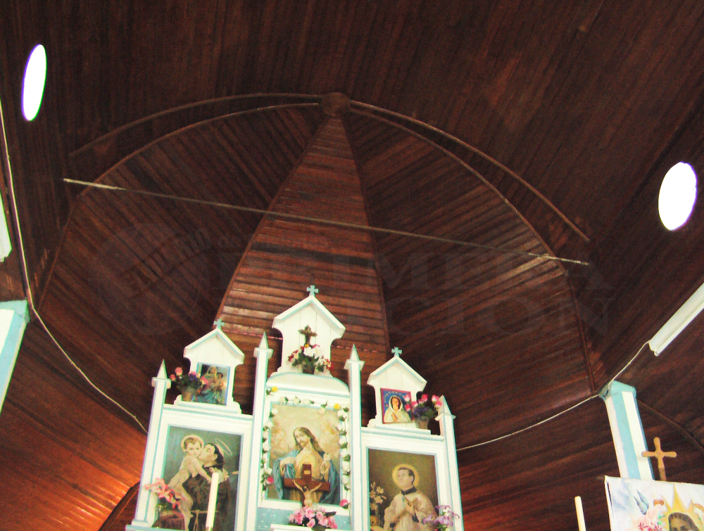 De acuerdo con la información proporcionada por Juan Boitasen, la Iglesia fue construida a mano. “Anteriormente se construía con la sierra manual, no existían las que hay ahora. La base de cemento no tenía, era todo de cepo. Y entonces era todas maderitas rajadas manualmente, había una cinta labradora y con esa se le rajaba bien. Después se fue cambiando… Más antes como había monte, los animales buscaban los cepos para acostarse y entonces los cepos se corrían… Lo que yo no sé es si primero se cambió por techo de zinc o si hubo otro material por el que se cambió antes. La parte de la alfombra sí fue hecha por mi finado padre y Wrubel.”