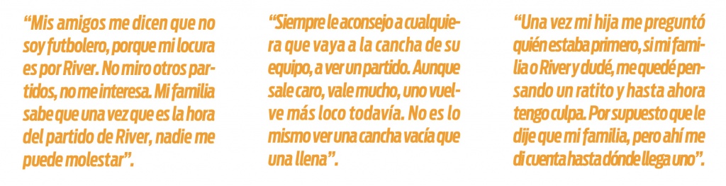 Miguel es vendedor ambulante y está casado con Nélida, que es hincha de Boca “pero no fanática, si no le pido el divorcio” y juntos tienen cinco hijos. “Son todos hinchas de River, al que sale de Boca le saco la herencia”, se ríe. Luego la familia creció y se sumaron tres nietos. Una de las nietas de Miguel, cuando “me quiere pelear” le dice que es hincha de Boca. “Pero no, no, son todos hinchas de River”, aseguró este hombre que también tiene un costado solidario. Junto a su señora dan de comer a más de 90 personas todos los sábados en el barrio Las Vertientes de esta ciudad. “Una vez mi hija me preguntó quién estaba primero, si mi familia o River… y dudé, me quedé pensando un ratito y hasta ahora tengo culpa. Por supuesto que le dije que mi familia, pero ahí me di cuenta hasta dónde llega uno”, dijo entre risas.
