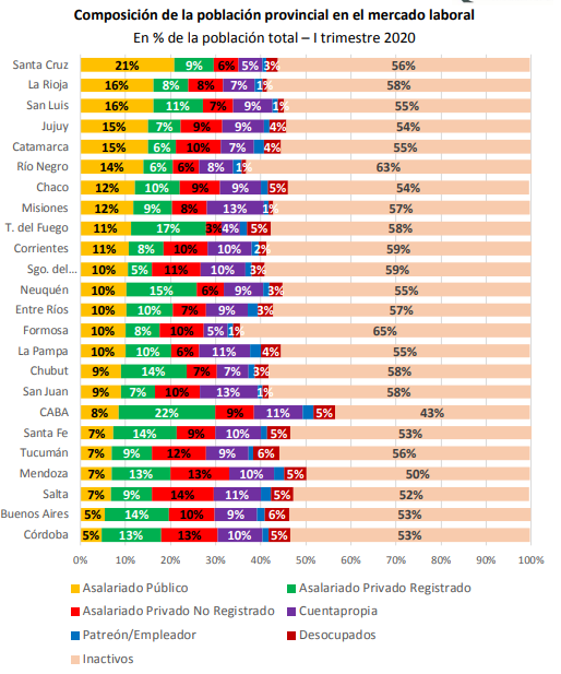 El mismo porcentaje (13) tiene la provincia de San Juan pero cuenta con una población menor, que no llega a 800 mil habitantes. Pero tiene 10% de asalariados privados no registrados; 9% de asalariados públicos; 7% de asalariados privados registrados; 1% de patrón empleados, 1% desocupado y 58% inactivo.