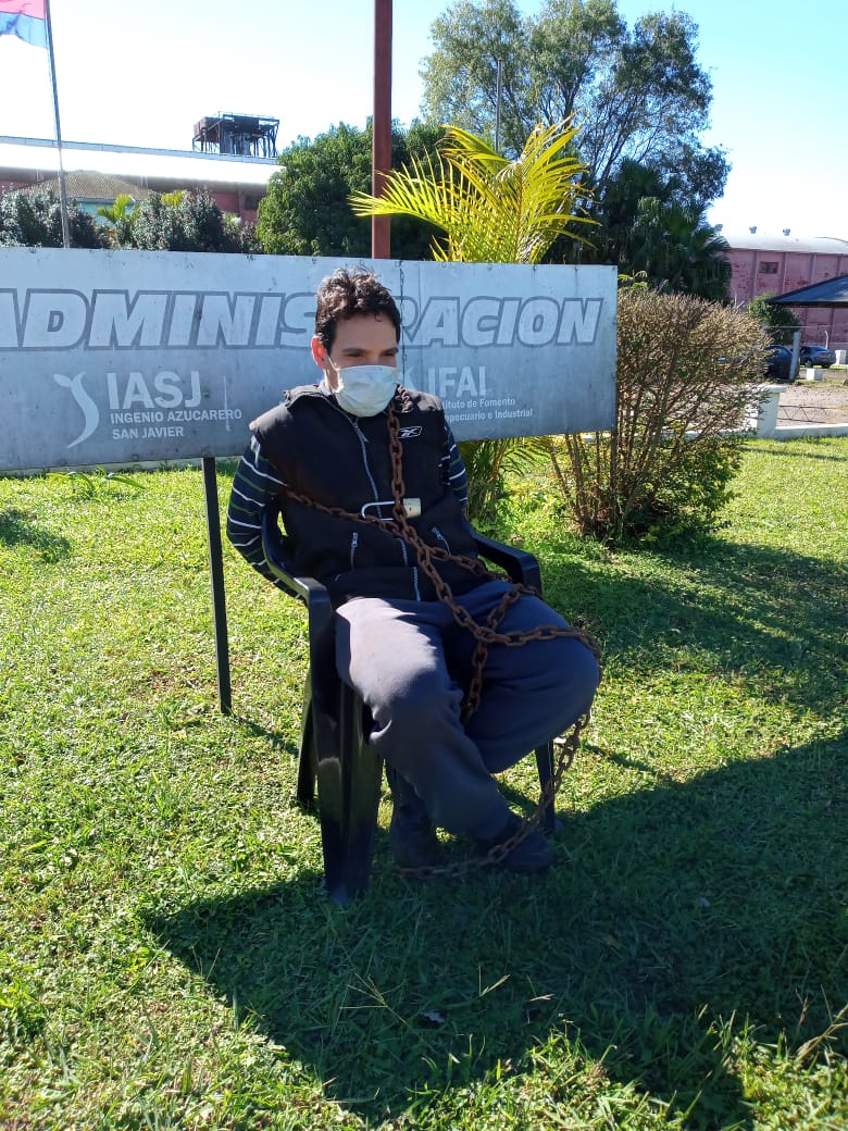 Sebastián Lovato tomó la decisión de encadenarse frente al Ingenio Azucarero. El hombre, padre de dos hijos, cumplía tareas en el sector agrícola y fue despedido en el mes de marzo, sin goce de sueldo. Reclama haber sido despedido “sin justa causa”, en plena pandemia.