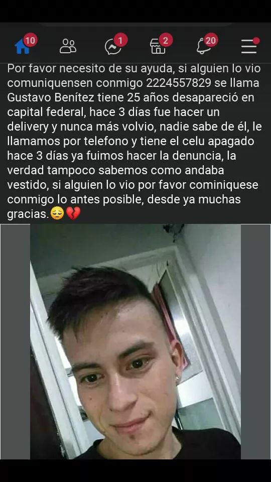 Es que esta situación le preocupó mucho a su familia ya que siempre estaban conectados. “Una chica que es amiga de él nos dijo que Gustavo no apareció, estaba preocupada porque él no es así. Se fue a hacer un pedido y no apareció, su jefe no sabía nada tampoco. Esperamos un día, buscamos por todos lados, tenemos tíos gendarme y familiares en la Policía Federal que buscaron si estaba preso o si estaba en alguna guardia de emergencia pero no estaba”, manifestó.