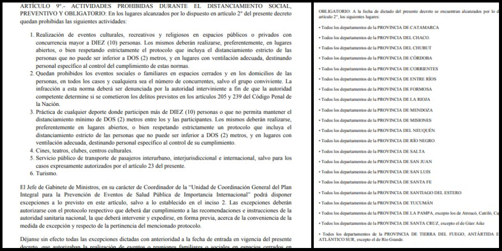 Para las zonas alcanzadas por el ASPO, en tanto, queda prohibido también el “dictado de clases presenciales en todos los niveles y todas las modalidades”, además de “eventos públicos y privados, sociales, culturales, recreativos, deportivos, religiosos y de cualquier otra índole que impliquen la concurrencia de personas”, y “centros comerciales, cines, teatros, centros culturales, bibliotecas, museos, restaurantes, bares, gimnasios y clubes”.