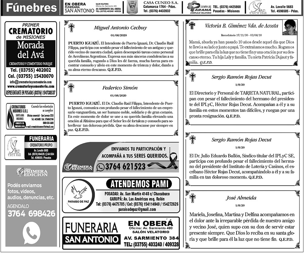 Fúnebres del lunes 3 de agosto de 2020