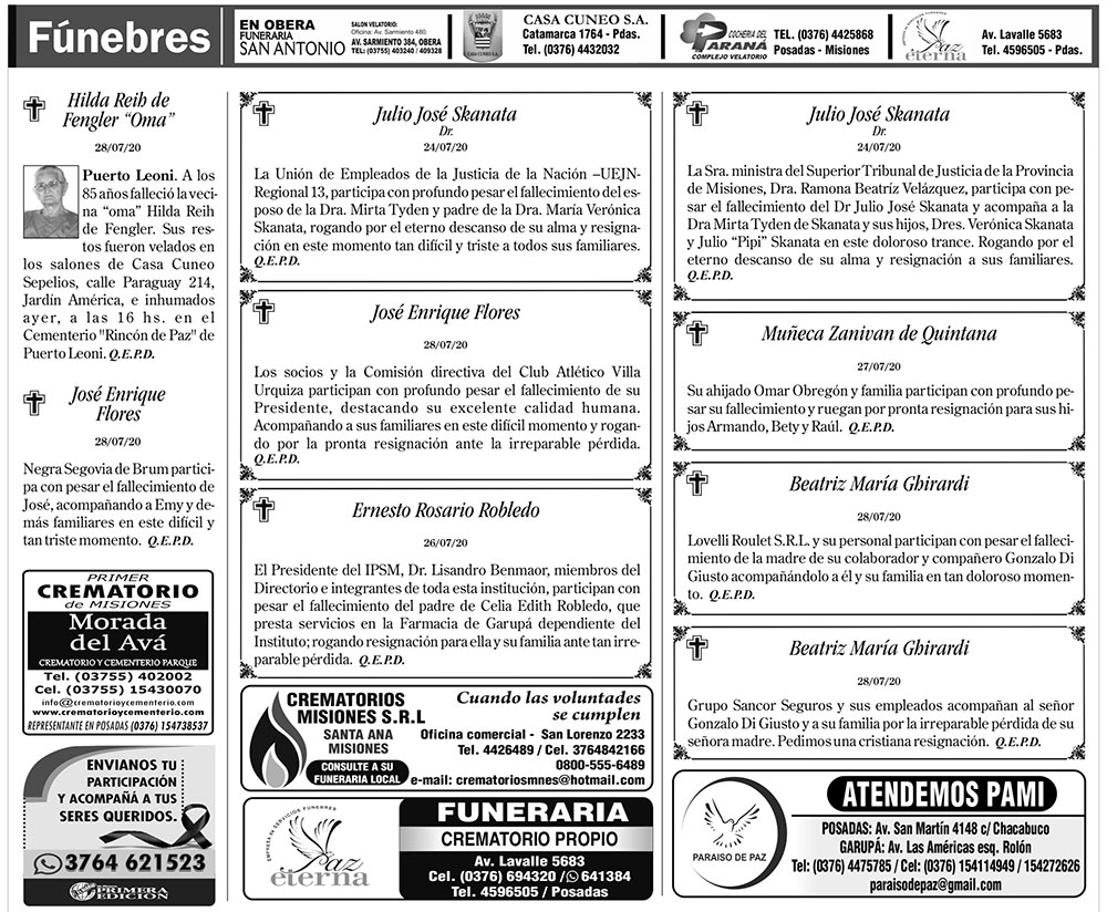 Fúnebres del miércoles 29 de julio de 2020