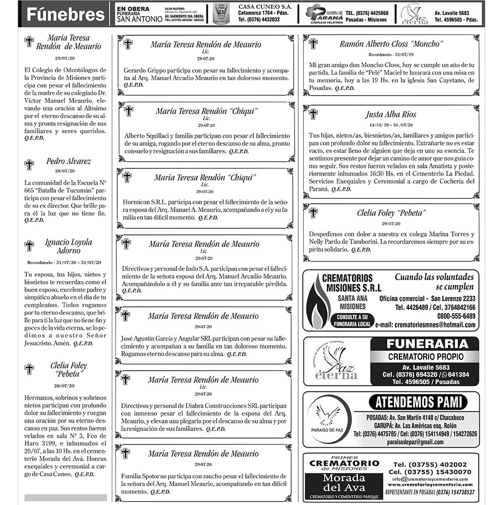 Fúnebres del viernes 31 de julio de 2020