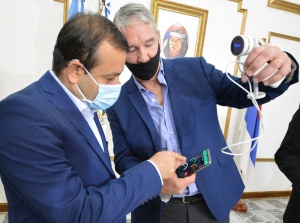 El gobernador Oscar Herrera Ahuad realizó la entrega formal de los termómetros infrarrojos inteligentes IOT, producidos en la provincia, a los representantes del Ministerio de Salud, de Gobierno y del Parque de la Salud. Fue en la sala de situación de Casa de Gobierno, donde el gobernador subrayó la importancia de trabajar a partir de la economía del conocimiento y la ciencia aplicada. Allí estuvieron presentes junto al Primer Mandatorio, el ministro de Educación Miguel Seddof, el ministro de Gobierno Dr. Marcelo Pérez, el ministro de Salud Oscar Alarcón y el presidente del Parque de la Salud Daniel Hassan.
