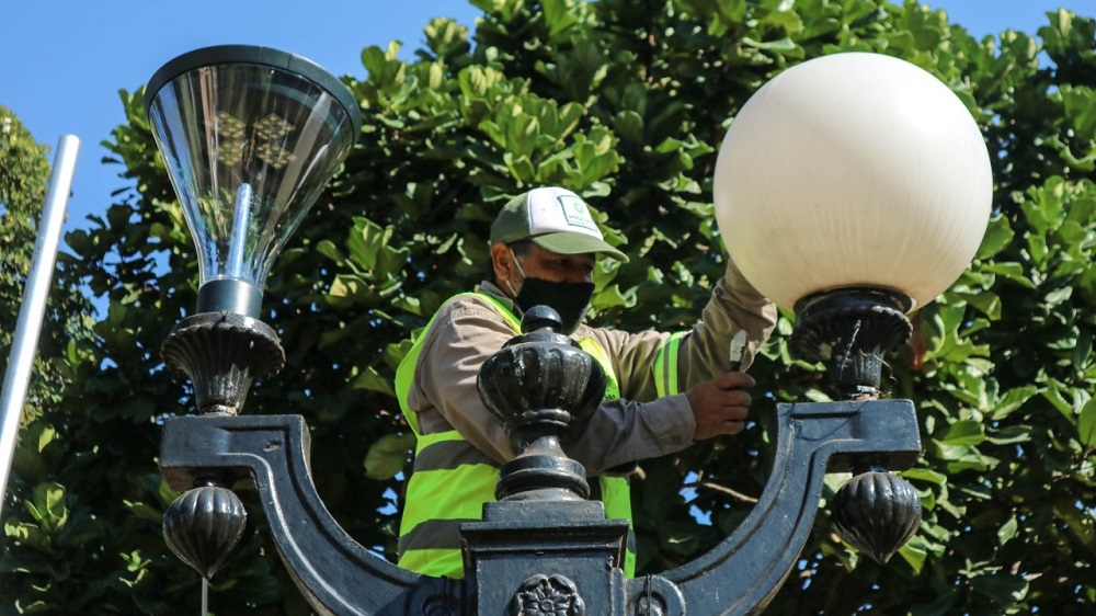Un equipo ejecuta la reparación en las plazoletas entre Colón y Rivadavia. Los arreglos se basan en el mejoramiento del cableado y la colocación de nuevas luminarias en postes adaptados para que pueda haber luz durante la noche, evitando siniestros viales y hechos de inseguridad en la zona.