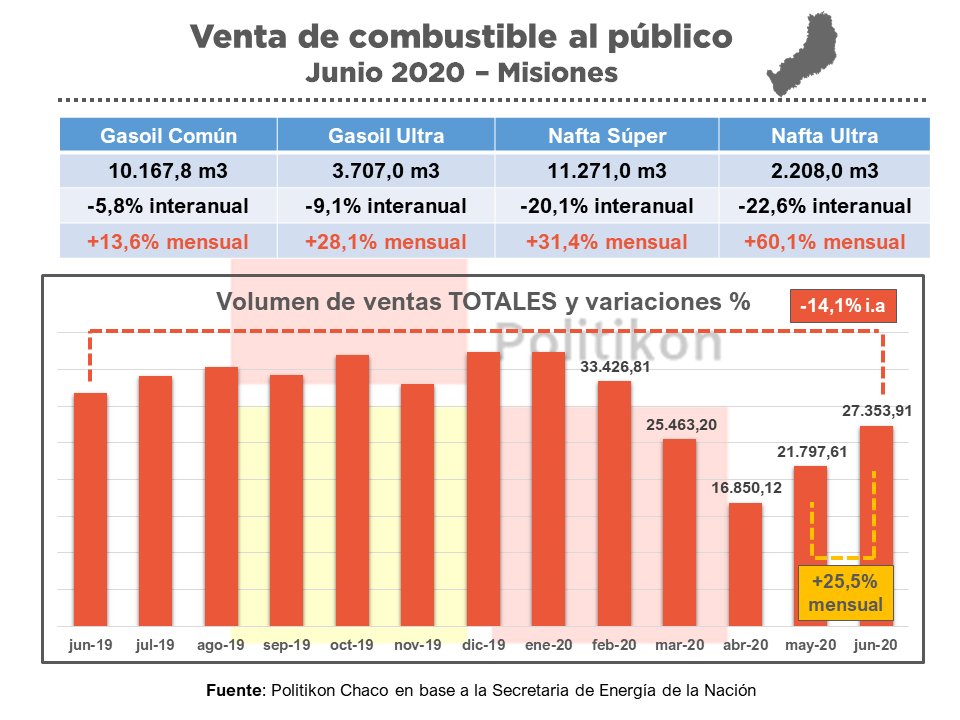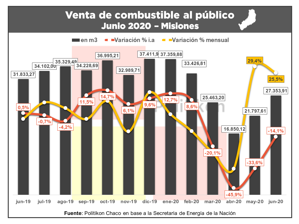 En ese marco, a nivel interanual Misiones tuvo una caída del 14,1% en el total de ventas al público, la más baja del NEA y por debajo del promedio nacional; pero experimentó un crecimiento significativo en la comparación mensual, donde creció un 25,5% (más alta del NEA), y en volumen, ya superó los niveles de marzo, previos a la etapa más dura de la cuarentena, de acuerdo a un informe publicado por la consultora Politikon Chaco.