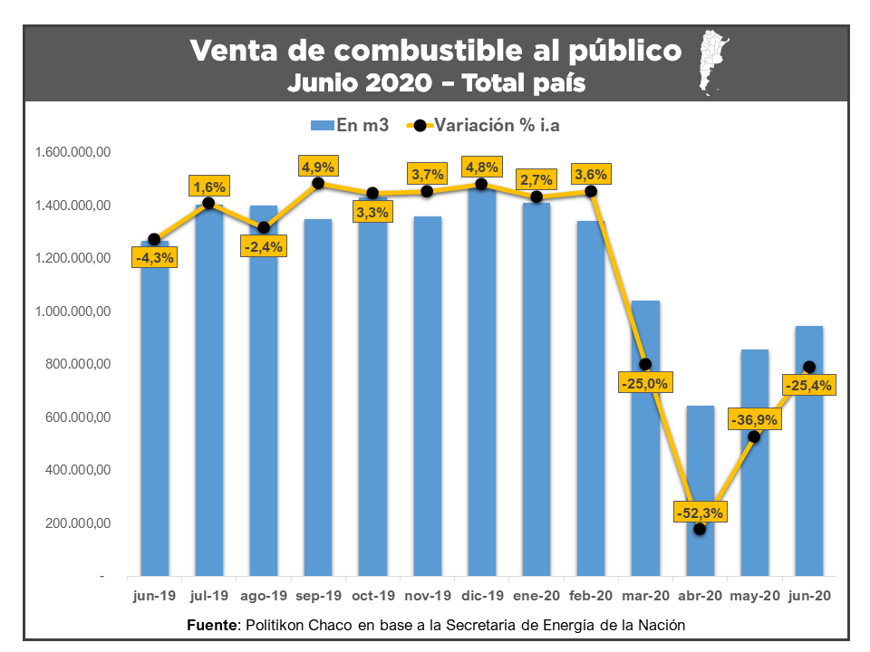 En el mes de junio 2020, las ventas totales de combustibles al público a nivel nacional totalizaron 945.351,1 metros cúbicos, cayendo un 25,4% comparado con el mismo mes del año anterior, un descenso que es considerablemente menor que la que se observó en mayo (-36,9%), habiendo crecido 10,2% en la comparación mensual.