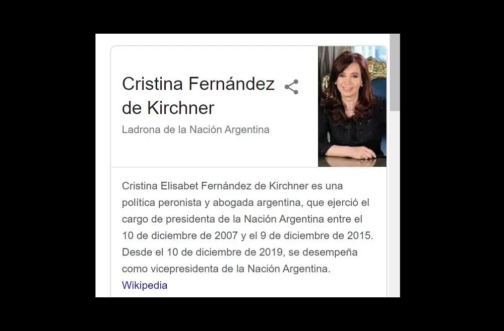 La ex mandataria realizó la presentación ante el fuero Civil Comercial Federal, en donde hizo referencia a una publicación hecha el 17 de mayo en la que se daba cuenta de que el buscador de Google había colocado una particular definición en el lugar donde debía figurar el cargo que ocupa: en el panel de conocimiento aparecía su foto junto a la leyenda “Ladrona de la Nación Argentina”.